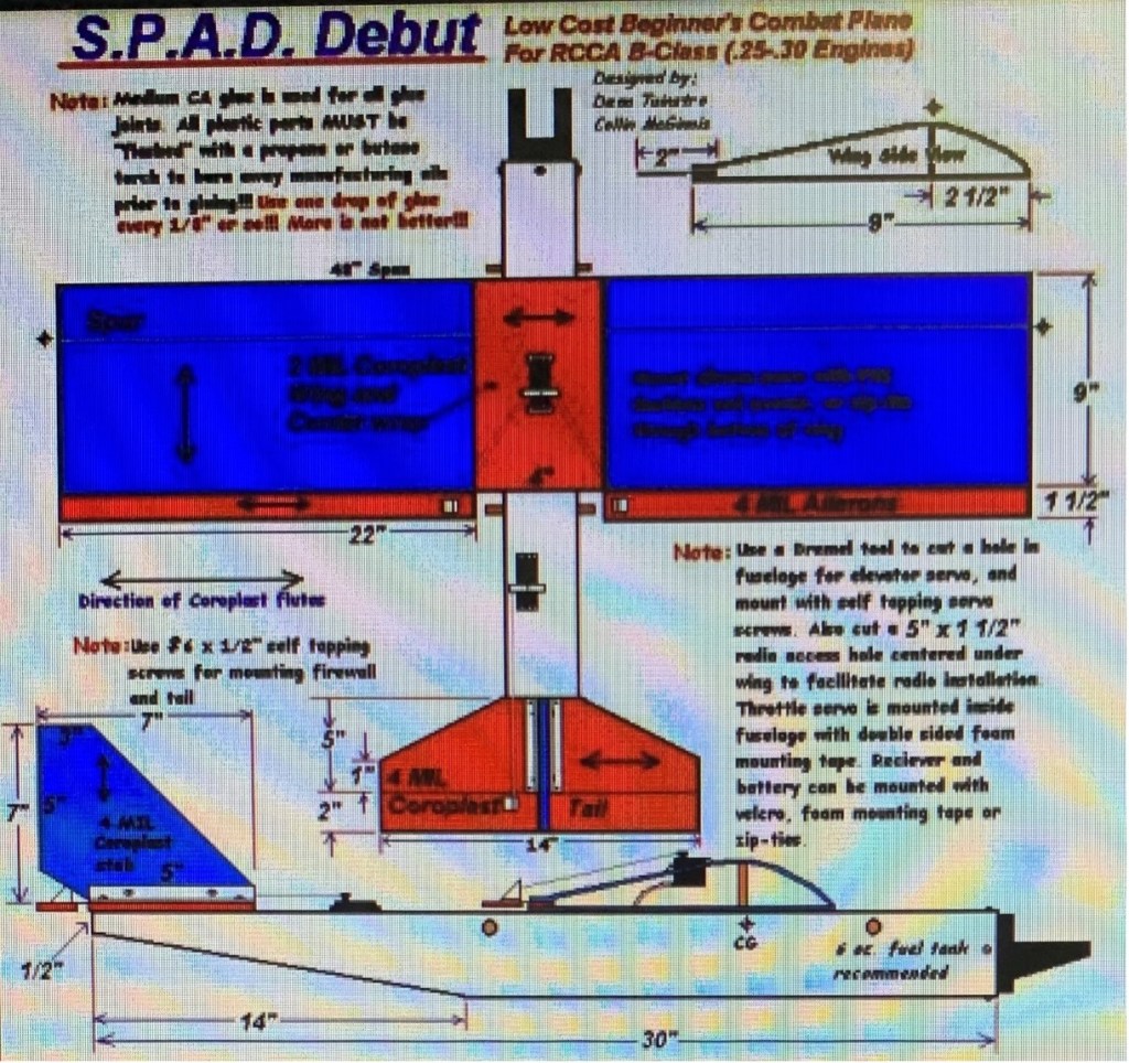 An R/C model airplane enthusiast from Michigan joined our Titusville Model Airplane Club sometime in 2001 and introduced the members in our club to the Simple Plastic Airplane Designs (SPAD) Coroplast R/C model airplanes. These amazing model airplanes are very inexpensive to build, while being of a very simple and rugged construction. They are designed and built to represent a verity of real airplanes and also used as expendable “Combat” contenders where a pilot tries to clip a 100’ streamer off the tail of his opponent’s airplane (with his propeller) without damaging either airplane (causing lots of mid-air collisions