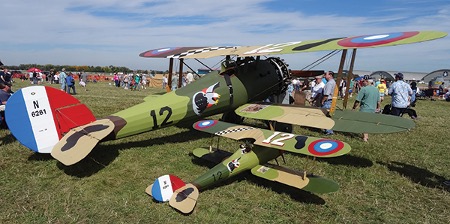 There were also many WWI R/C model biplanes and triplanes at the fly-in, which ranged in size from the smallest (¼ scale) to the largest (½ scale) models that flew at intermissions. Of course, the R/C pilots were also dressed in WWI costumes with leather coats, caps, and flight goggles to make their appearance fit in with the overall reenactment venue of the event.