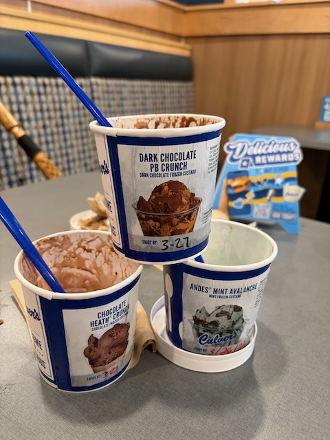 We aren’t big on the trappings of Valentines celebrations. Crowded restaurants, kind of ruin the romance vibe. Two years ago Culver’s restaurant opened in our town. They specialize in ice cream with the Flavor of the Day rotating through out the month. If the restaurant doesn’t sell out of the flavor of the day, they pack it into pint containers and place them in a glass front freezer for sale.