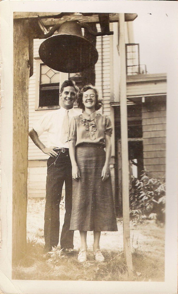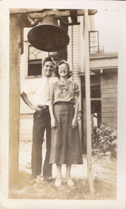 Kitty and Charles Wills under the Engagement Bell at Wheaton College.