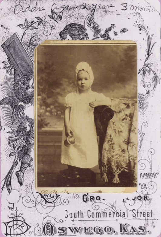 My Grandmother at age 2 years 3 months. The “frame” around the picture is the back of the photo, blown up. I thought it needed to be seen – to show how photographs were done in the early 1900’s.