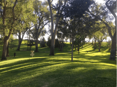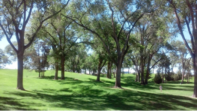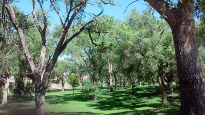 The park’s 13 acres feature more than 2,250 trees and bushes, including umbrella catalpas and some 200 Siberian elms. There are grassy areas for picnicking, along with a Frisbee golf course. Of interesting note, the abutment on the south side of the park was made from stone recovered when the county jail at Rio Grande and Central was demolished.