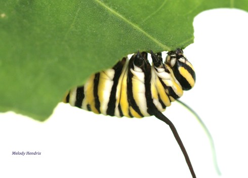 The female lays about 100 – 200 eggs on milkweed leaves, their host plant. Within a few days the baby caterpillar starts squirming. It’s ready to hatch.