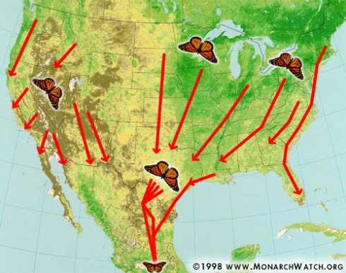 The monarch is the only butterfly known to make a two-way migration as birds do. Unlike other butterflies that can overwinter as larvae, pupae, or even as adults in some species, monarchs cannot survive the cold winters of northern climates. Monarch butterflies (Danaus plexippus) perform annual migrations across North America which have been called “one of the most spectacular natural phenomena in the world”.