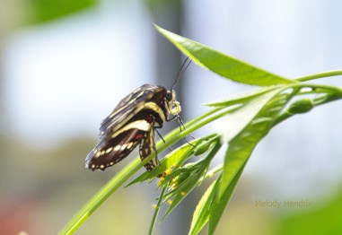 It makes a creaking sound when alarmed. Zebra longwings feed on nectar and pollen. They are the only butterflies known to eat pollen, it collects on it’s proboscis.