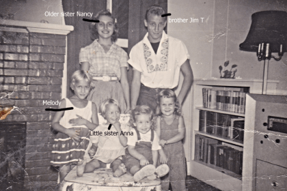 Growing up in the 60’s and 70’s our family had little money. Our mother was widowed twice before she was twenty-five years old, and she ended up with four kids to look after on her own. She knew about pain and she knew about life. We children were her life, and she allowed us to be as carefree as possible. Sometimes, though, if she thought we needed chastising, she would call out a name, which many times was the wrong name. We thought it was funny, and our laughter got her back into a good mood. When Mom wanted to let me know I was in trouble, she’d call me, “Melody Jane.” In these cases, Jane was a bad-girl name. My friends heard it a few times and thought Jane was my middle name. Most of the time, though, Mom called me Honey-Dear.