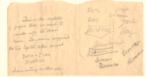 The story about my name went like this: toward the end of the two weeks, the nurse came into our room and told Mother and Daddy that they had to name me or they couldn’t have a birth certificate nor could Mother and baby go home. Now,this is what I think had happened. Daddy really wanted that boy and they must have had boy names picked out, but no names for girls. When the nurse saw that they were flummoxed, she suggested they put their two names together. They worked on it on a scrap of paper and finally came up with DiVoran, with two capitals, one from each of their names.