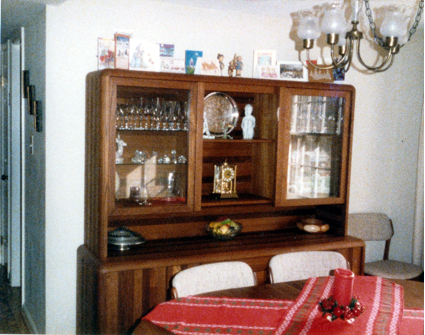 I really liked the kitchen! The previous owners had renovated it, so that one wall that had been just empty, now held cabinet space and drawer space, as well as the stove. They had also installed a microwave – but they had cut a hole in the wall and made a brace on the wall in the garage to hold the microwave. All we saw in the kitchen was the front of the machine! We also didn’t hear the machine when it was running. Nice and quiet. The space where the stove was originally (next to the door leading to the garage), now became a very large pantry. There was cabinet space galore, and a window over the sink, looking to the back yard. The refrigerator was at the end of the cabinets, next to the doorway to the dining room.