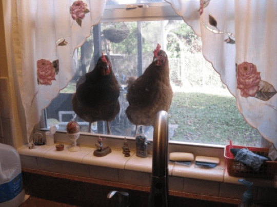 Now this is the amazing part of the story.  Every evening around dusk, the two chickens would let us know it was time for them to go to bed.  They would jump up on our kitchen window sill and peck on the window.  I kid you not!  Just so you would believe me when I told you this story, I took this picture of them on our kitchen window sill looking in.