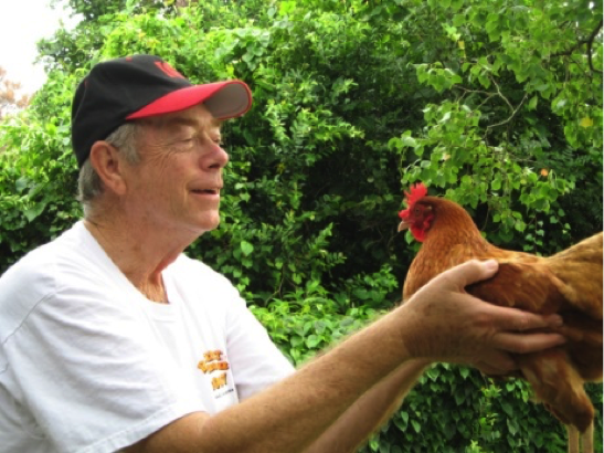 At the time of this story he only had two of the Road Island Red chickens left.  They wanted to go on vacation, but he was afraid that if he let the chickens run free, a fox was sure to get them.  So he asked DiVoran and me if we would keep them for the 2-weeks they would be gone.  He assured us that they were well-mannered and would be no trouble.  We said, “Sure” since our backyard was fenced and backed onto a wildlife area (no neighbors to bother).  Billy brought over a nice “portable” coop for the chickens to sleep in, and we set it up over papers, with food and water on our screened back porch. Every morning we would let them out into our backyard, with food and water, and they pretty much took care of themselves.  They did a dandy job of free “Pest Control” in our back-yard.  We were glad for that, but I’m not sure how happy the birds were about it.
