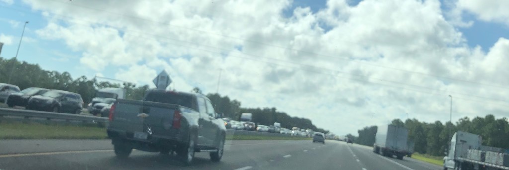 To our surprise, the further south we drove, the heavier the traffic was heading north. I knew that large numbers of people from the north who owned winter homes in Florida had fled the cities to ride out the virus there. Were they migrating north to vote as we were heading south? A severe auto accident south of Jacksonville halted the north bound traffic for miles. A static snapshot of the traffic.