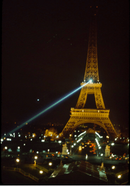 As Fred and I watched the few minutes of the sparkling lights on the tower, we were reminded that, back in 1981 when we visited Paris with our girls, there was a “blue” laser light projected from the tower. We took pictures (35 mm slide photos) of the tower and laser, but were informed that the laser light would NOT show up in photos. Below are the photos we took, contradicting that information. We were amazed and pleased at the outcome of the pictures we took.