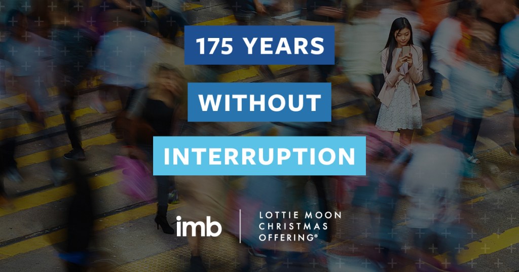 “Well over 100 years ago, a single missionary named Lottie Moon, while serving in China, began writing letters challenging the American church to send and support more workers to go there. After her death on the field, her challenge was heeded in the formalization of an offering in her name. Even if you’re not a Southern Baptist who has given to the Lottie Moon Christmas Offering, her life is a reminder of why we must give to send and support missionaries serving among unreached peoples in unreached places.“