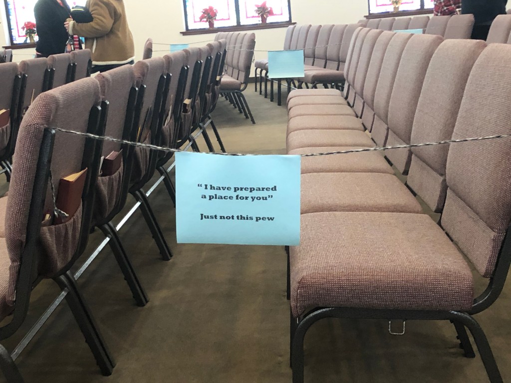 I do have a picture from church, though. Due to my husband’s heath issues we have not been to services inside the sanctuary. Sunday was my first time for in person worship service and I got a kick out of this sign. “I have prepared a place for you” But not in this pew.