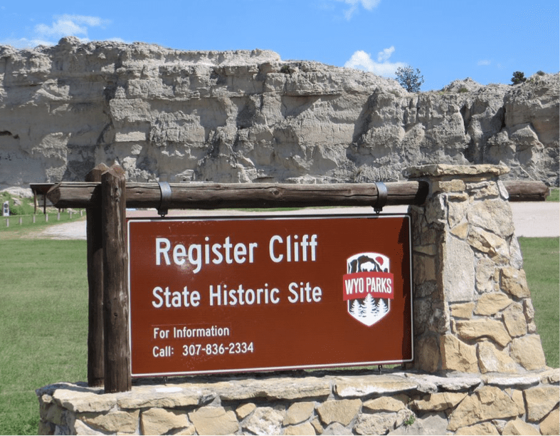 On my way to Fort Laramie, WY on US-26 I went thru Guernsey, WY and stopped to see the Cliff Register & Oregon Trail Ruts. As it turns out this State Historic Site is located just south of town and adjacent to a bend in the North Platte River. The identification marks of many pioneers can be found on the Cliff, near the spot known as the first overnight stop west of Fort Laramie, for Oregon Trail travelers on their way to California.