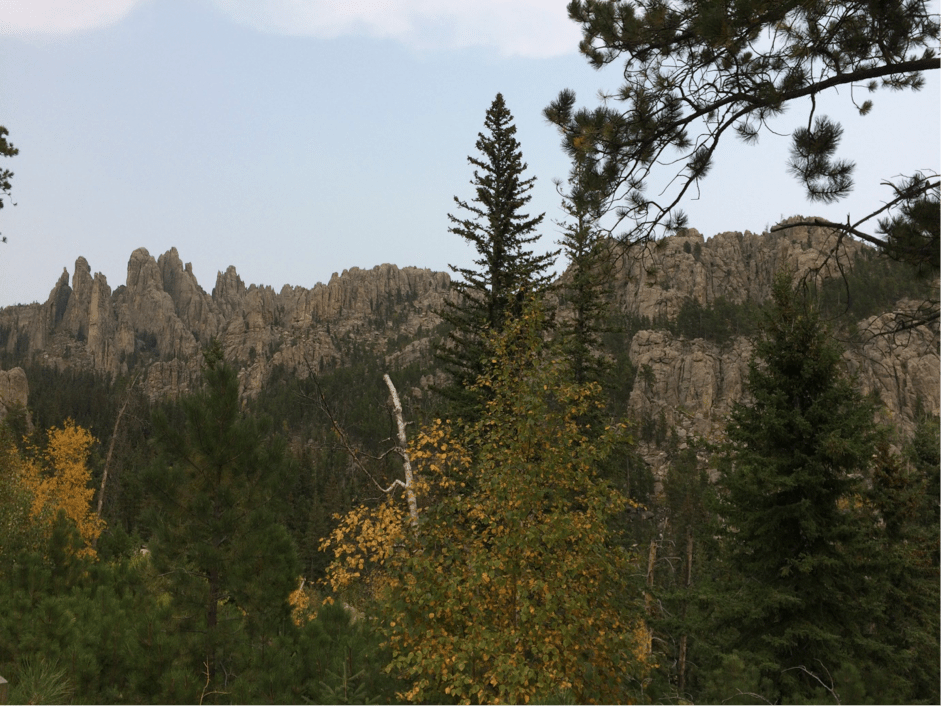 As I wound my way north thru the Custer State Park, I spotted people stopped along the road and saw that they were taking photos of some buffalo grazing in a medow. Believe it or not, this was the first free-range (live) buffalo I have ever seen in all my travels! The next thing I knew some really jagged rock formations appeared. They looked a lot like the rock formations I had seen at the Garden of the Gods area in Colorado.