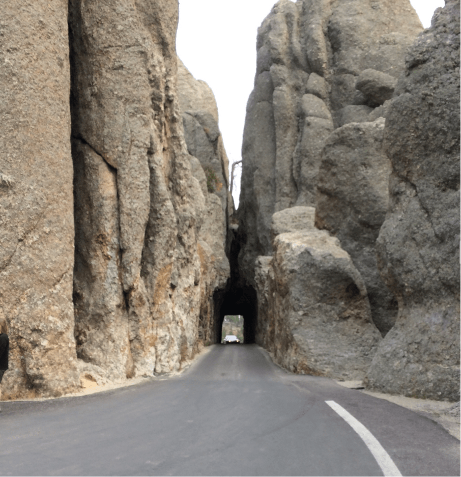 I was still headed north on US-16 toward Hill City, but the road was slow going (25 mph) as it twisted and turned thru the park. Then I came around a curve and the road went thru the Needle Eye Tunnel. I just had to get a photo of that tunnel. Luckily, when I came out of the tunnel, there was a turn-off where I could stop and take a picture.
