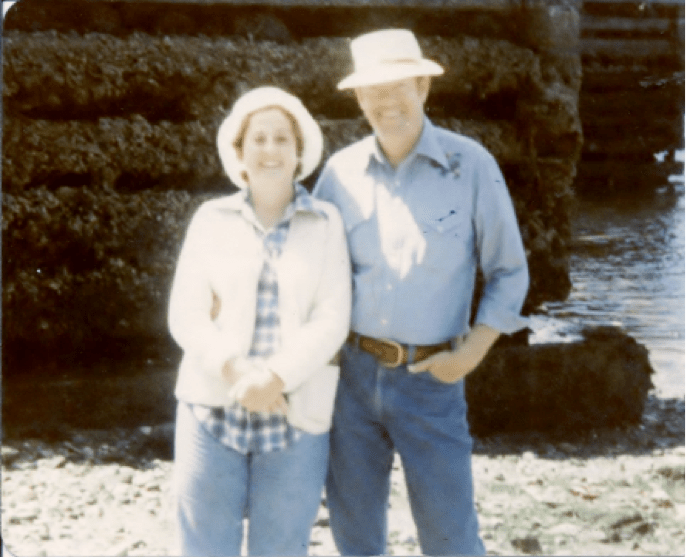 Another day Ivan took us to the clam beds (again at low tide) to dig for Horseneck Clams. We learned how to watch for the clams to spout water in the air; then we would rush over quickly, and dig them up before they could borrow their way back down into the sand. What an interesting learning experience that was. DiVoran and I learned to eat a large variety of seafood, and other things (well at least I did), during our visits with Ivan and Dora.