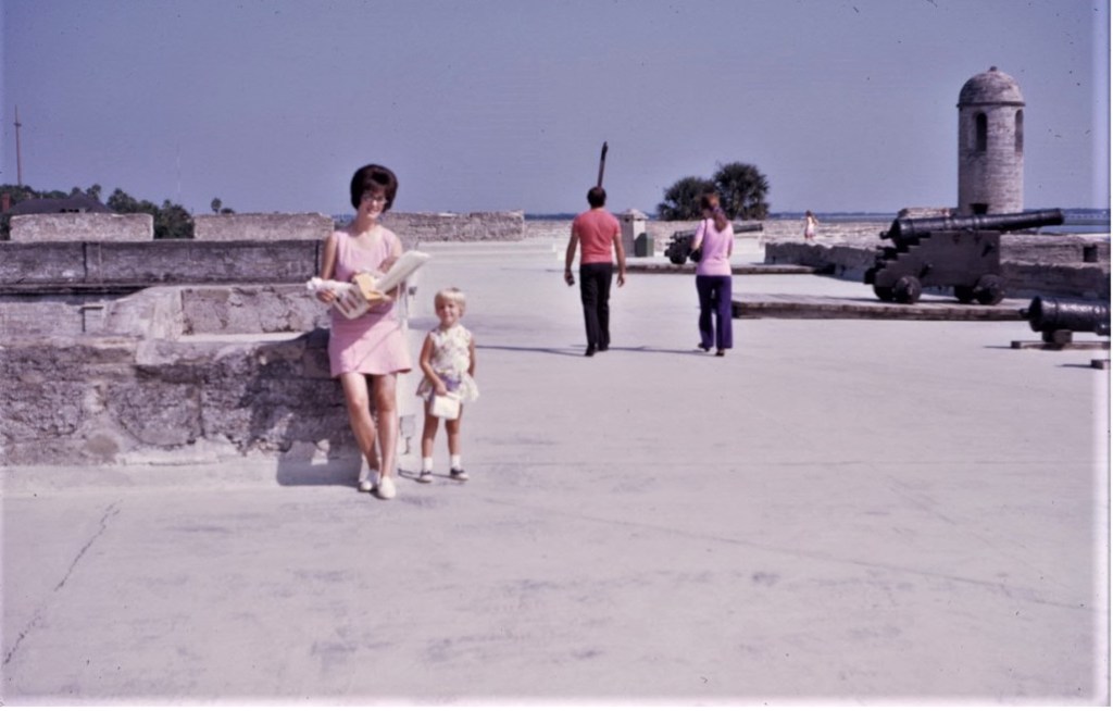 Here’s a picture of an outfit I made from cotton/polyester. It was a sleeveless, dropped-waist summer dress, and most comfortable to wear. Here we are in St. Augustine, Florida, as we were moving from Maine to San Antonio, Texas for Fred’s next assignment. It was in September, and the weather was warm enough for a cotton-blend outfit. I made several outfits in the same style, because I liked the pattern so very much.