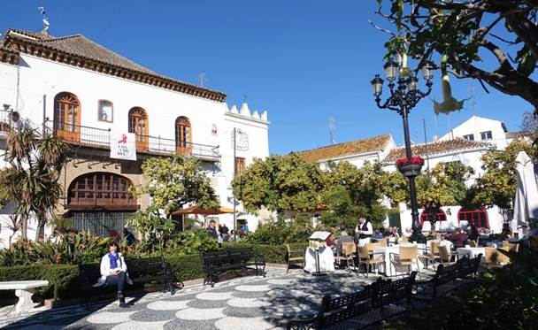 Most of us were glad when it was time to get back on the bus. That was quite an exercise, walking the streets of Ojen. Once we were back on the bus, we headed south only about 15 or so minutes for a visit to the town of Marbella. This town turned out to be a haven for the rich and famous and those from all over Europe, who can afford to live richly for a week or two on the famous Costa del Sol. Situated at the foothills of the Sierra Blanca mountains, Marbella’s beautiful Mediterranean beaches are lined with elegant hotels and lavish villas for ten miles in both directions.