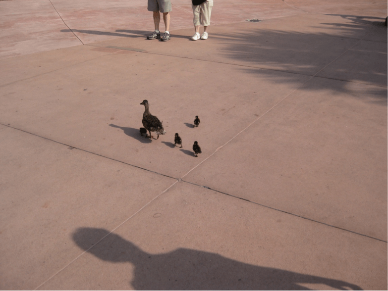 But Spring brings its own neat stuff. One of our favorite things to do – especially at Disney and especially at EPCOT, is to be on the lookout for new baby ducks. We’ve seen them swimming in the ponds quite often, so we look there. Occasionally we see them following-the-leader (momma duck) along some of the walkways.
