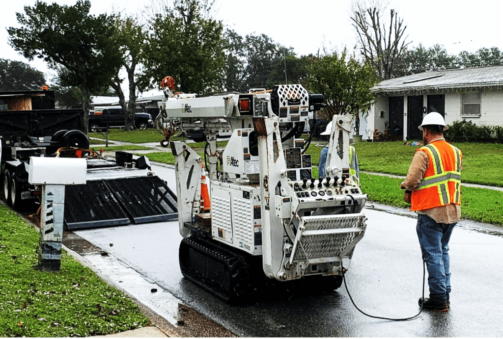 Well, here it is Monday morning, and the crew showed up as promised, right on time, with their three big trucks and the same four workers. This time they had brought along a remote-controlled (tracked) mechanical machine to do all the heavy lifting for them, and to provide access to the pole installation area.  When I first saw it sitting on its trailer, I couldn’t imagine how that small machine could do all the work that was going to need to be done.