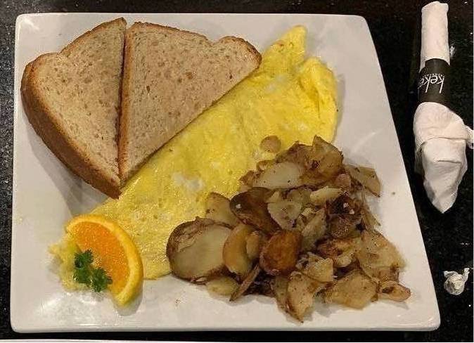 Our server seated us, told us his name is Chris, and he would get us anything we wanted.  Really nice guy, and a great server.  He brought our drinks and gave us time to peruse the menu.  I ordered a 3-egg omelet (veggie – tomatoes, onions, mushrooms).  It came with home fries and toast.