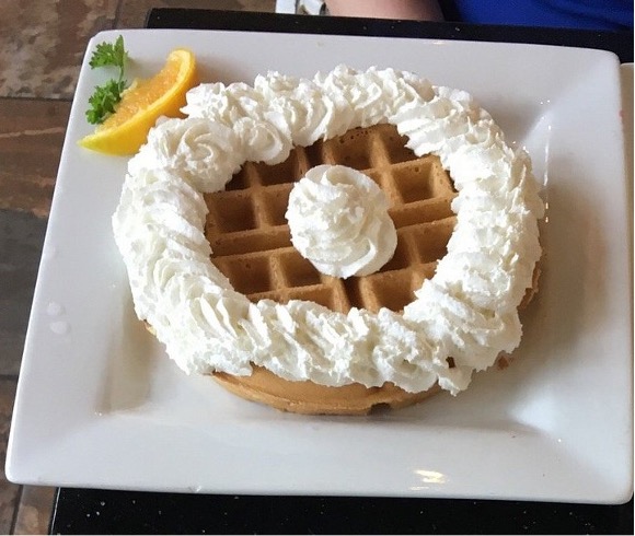 I shared some of the omelet with Fred as well as the home fries.  Fred ordered a Belgian Waffle with fresh blueberries and tons of whipped cream!  He shared some of that with me.