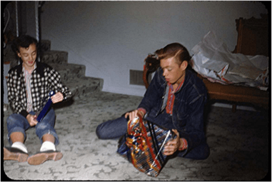 1954 – Bill and me – opening presents at Aunt Jessie’s house