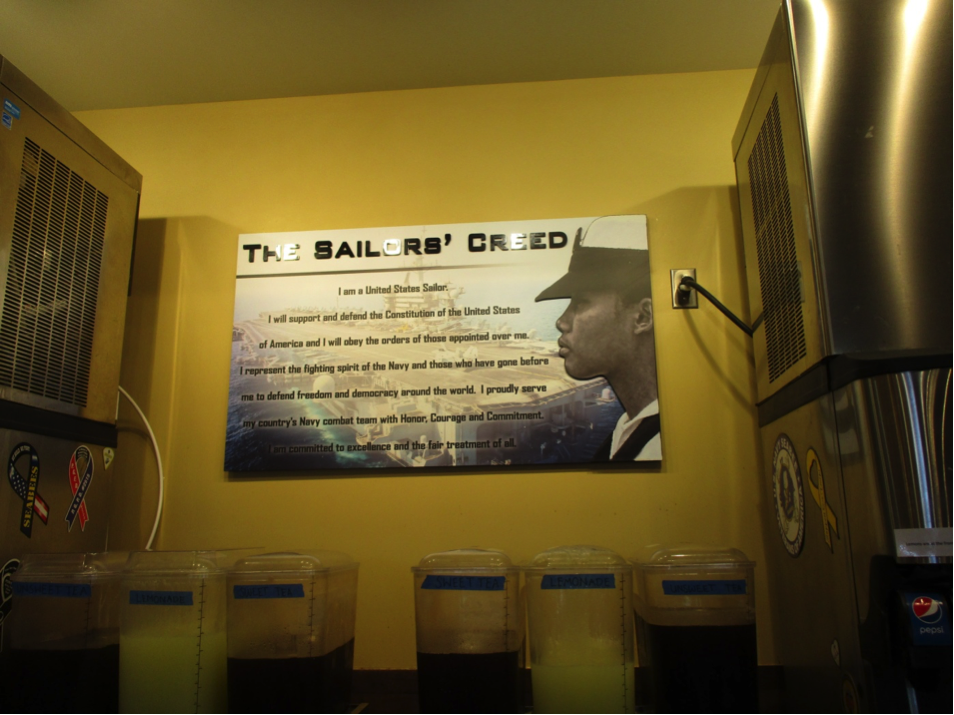 Recently, it was “Armed Forces” week, with Armed Forces Day on the following Saturday, so Mission BBQ had a special day for each branch of the service. The day we were there was honoring the Navy, and four cadets from a local high school presented the color guard. Very touching.