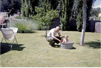 My brother, Bill, with his young daughter in our back yard she loved to “swim” in Grandmother’s galvanized tub clothes line to the left; garbage can cutout to the right peach tree behind Bill that Daddy pampered.