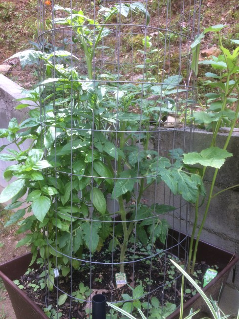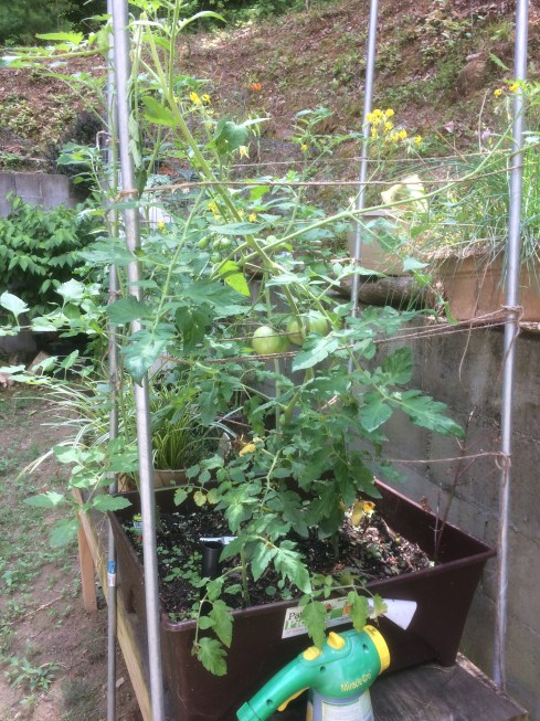 We haven’t figured out how to grow vegetables in clay soil, so I have resorted to having two small raised beds. I am growing three tomato plants, basil and an okra plant. They are doing well so far. Hopefully the tomato worms won’t climb up to them. I do not like those worms!