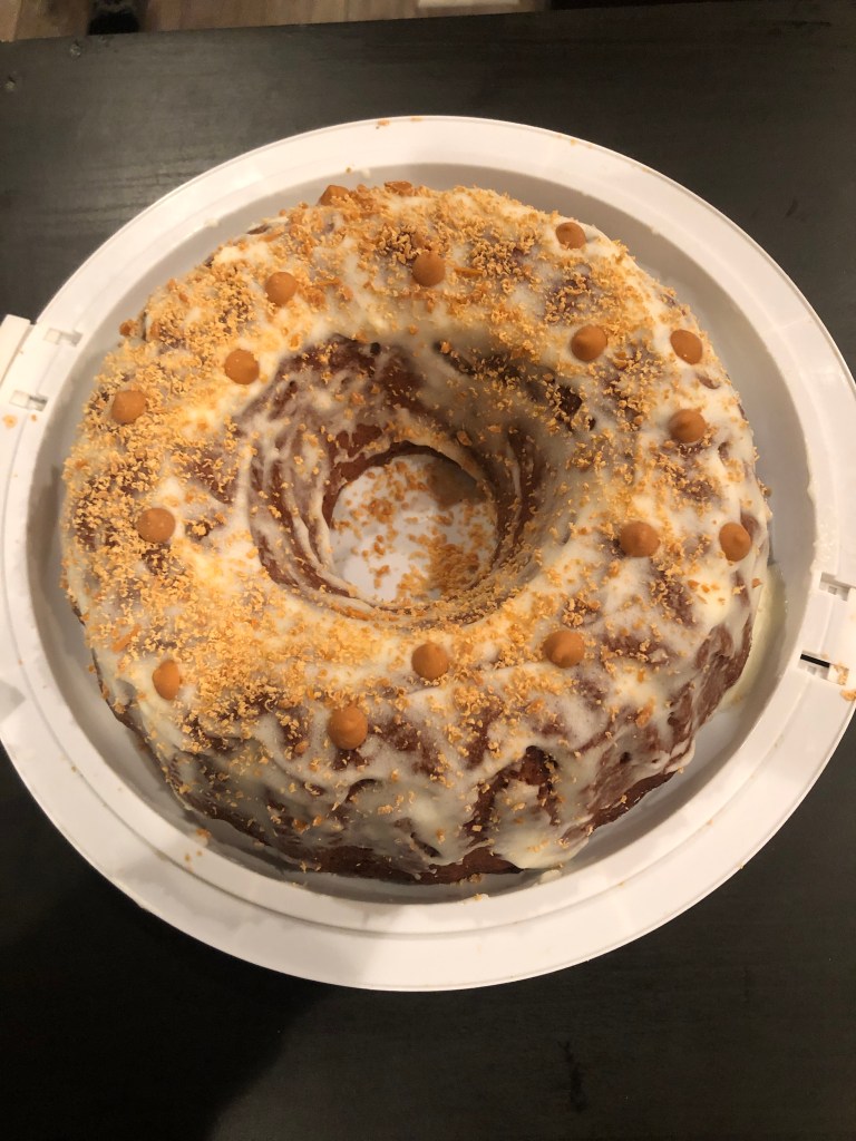My daughter made butter cookies in Florida and wanted to make them again for us and we were both craving gingerbread so we added it to the baking list.We follow a Keto eating plan so our deserts and treats don’t always look the same as traditional versions. For instance instead of a dark colored gingerbread, we made a gingerbread bundt cake with a lemon glaze. Without the addition of molasses, the batter lacked the trademark deep rich color and I didn’t want to sacrifice the flavor as well. To try to capture it I added some maple extract and a smidge of expresso powder. Next time I will add a bit more expresso powder. We decided to shave some sugar free pumpkin spice white chocolate on top, then sprinkle with a few whole chips, Definitely not the look of gingerbread but definitely good!