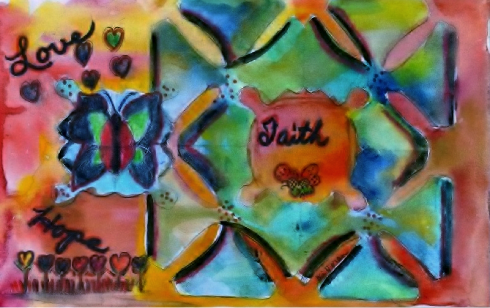 This was painted by our daughter, Karen, when she was rather young. I actually don’t remember when she gave it to us, but we’ve had it a long time. And we both treasure it. It is a memento of the love she had as a child for her parents.