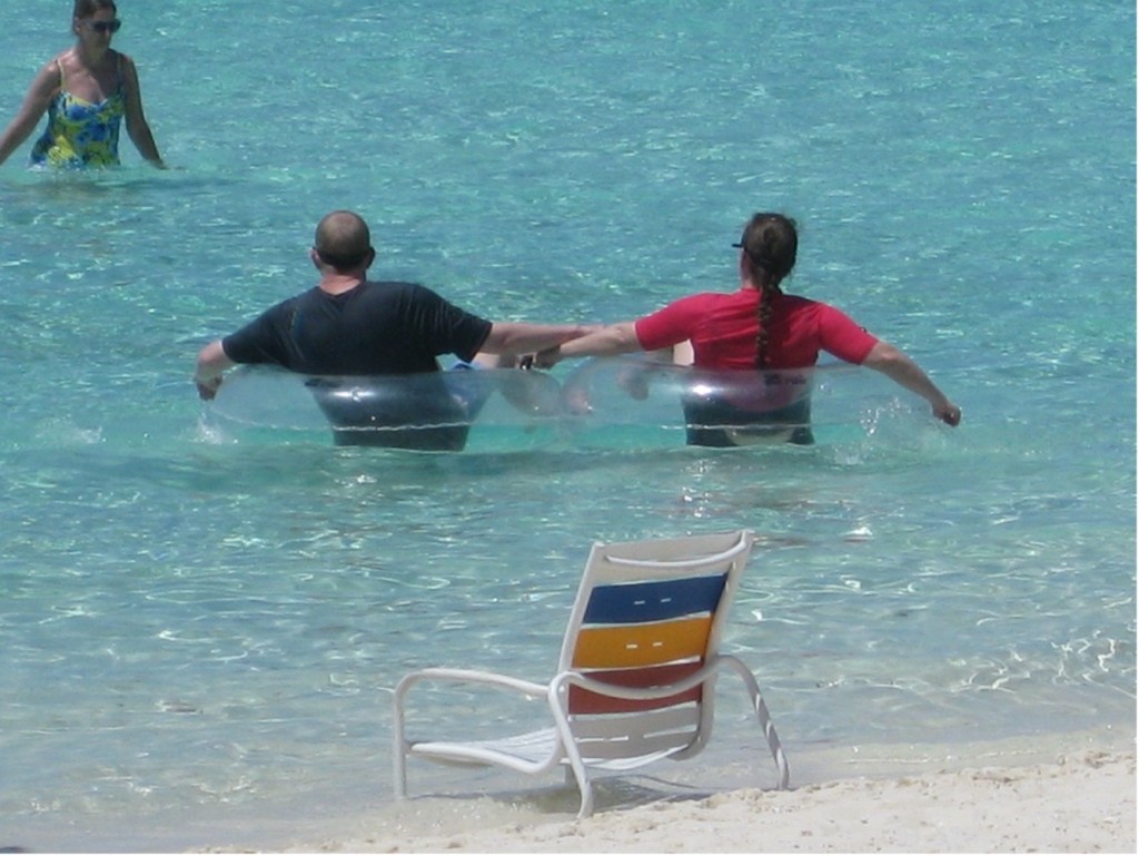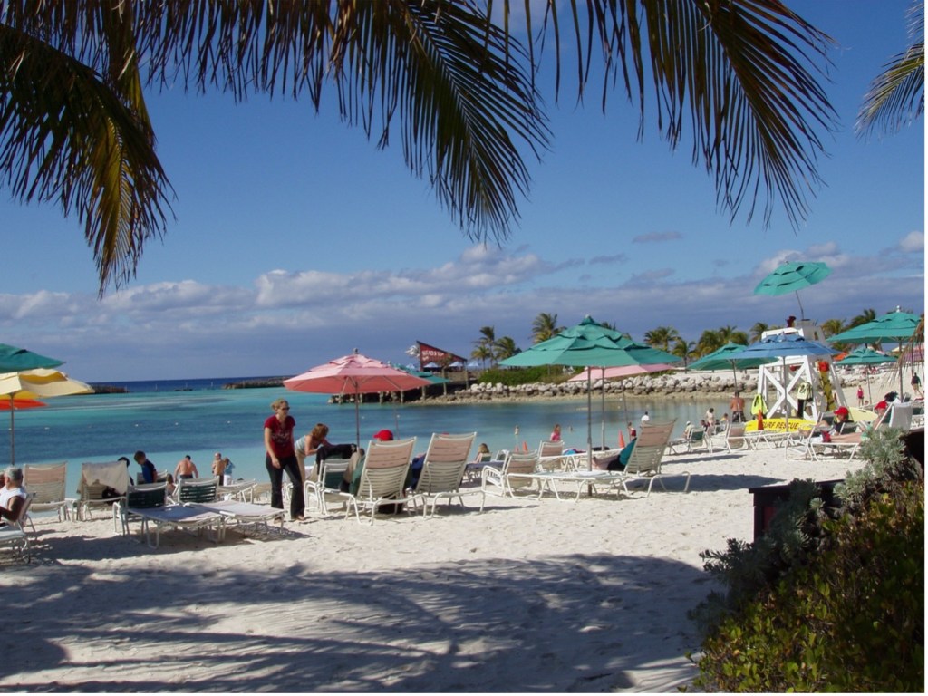 While we were down at that beach, it became time for lunch, and they were serving BBQ that day. So we loaded up our plates and found a picnic table. Some of the ship’s servers always go onto the island to help with the meal, and so we get to meet other servers. This particular day, after sitting down, one of the servers came to talk with us. I didn’t catch his name, but noticed that his name tag said he was from Brazil. I asked him if he enjoyed working for Disney, and he replied, “it’s a job.” He said the thing he missed the most was his child back in Brazil. He had just come off a vacation, and was a bit homesick.