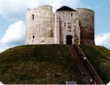 A reconstruction of York Castle in the 14th century, viewed from the south-east