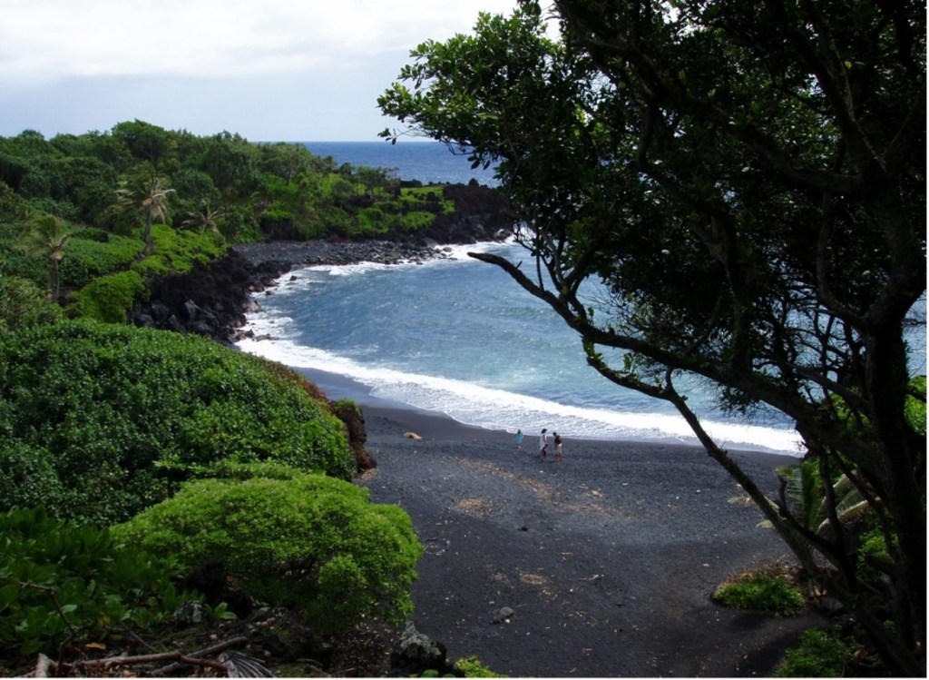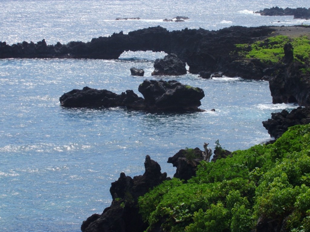 It’s actually the small Honokalani Black Sand Beach and is composed of small, smooth lava pebbles. The volcanic rock must be good soil, as the area is quite lush with greenery. One of the most fascinating sights to me was the “arch” – the volcanic rock worn away by the ocean, leaving the arch.