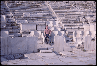 Fred sitting in the priests seats in Dionysus Amphitheater at the foot of the Acropolis