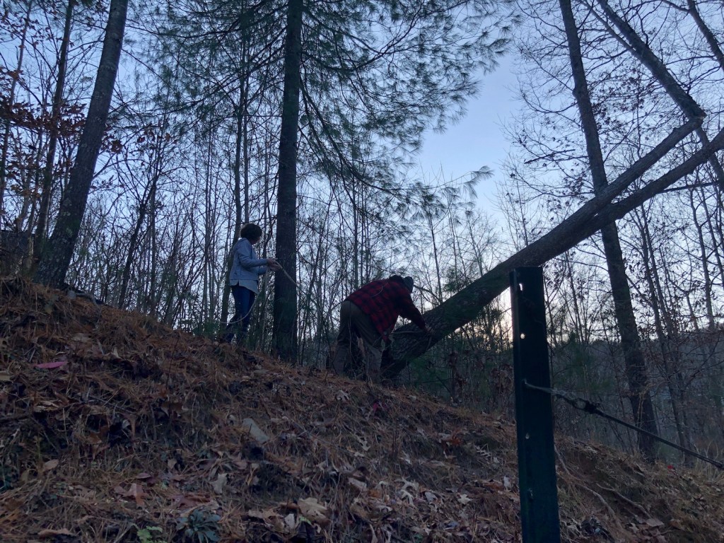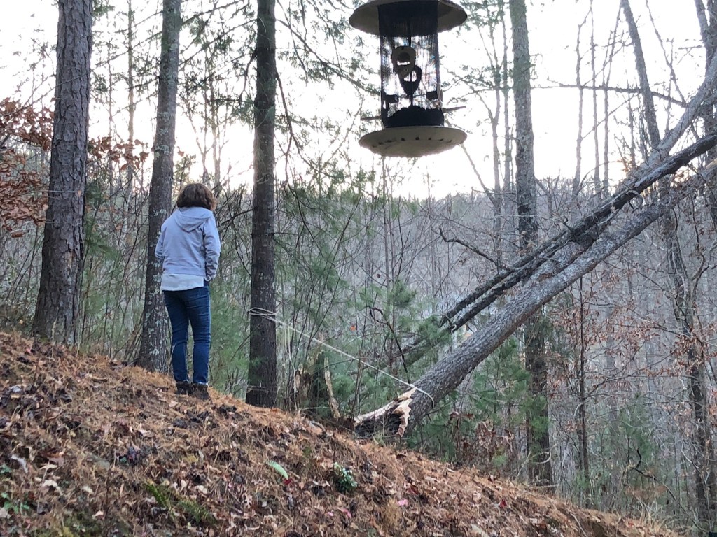 Saturday evening a cold front moved in bringing with it rain and heavy winds. I heard some noise during the night but didn’t think much about it. I always hear noises. Sunday as we were backing out of the driveway on the way to church, my ever observant husband spotted at tall pine tree down at the back of the house. We have a lot of trees and the downed one was stuck in the top of one. We were thankful for this as it prevented the tree from falling on our roof! Getting it the rest of the way down would prove to be challenging.