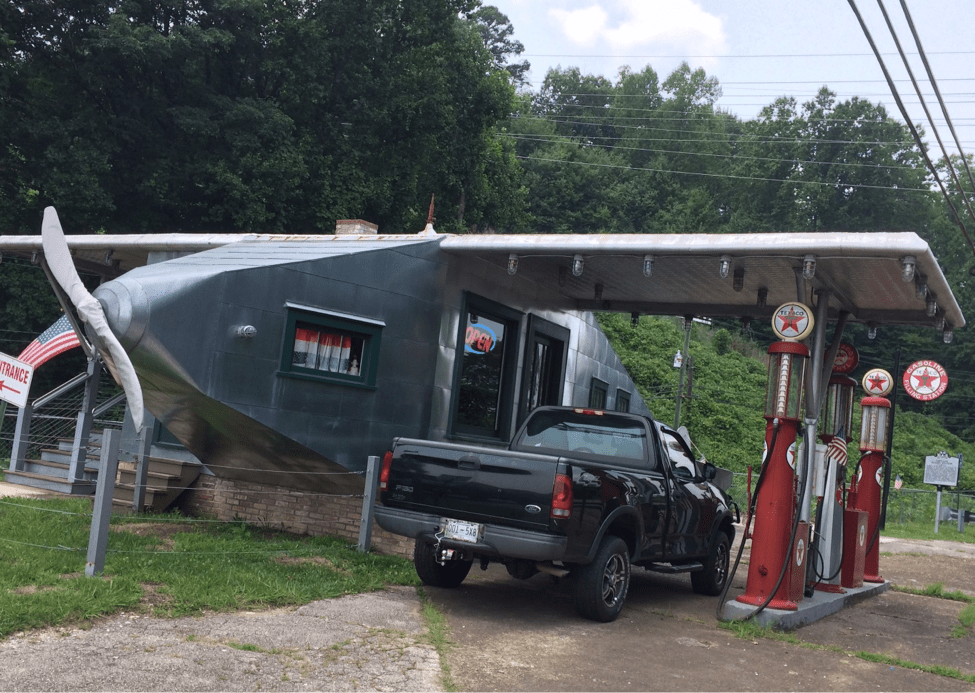 I continued 25 miles south on I-75, diverting a few miles toward Powell to check out the Airplane Gas Station located in northwest Knoxville, TN. This unusual station was originally created by Elmer & Henry Nickle in 1930 to attract the attention of US-25 travelers. The brothers operated the station until sometime in the 1960s, when it sold and became a liquor store. Over the years since then the airplane building has been used as a produce stand, a bait & tackle shop, and even a used car lot. It is currently a barber ship.