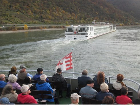We were given two hours of free time, to look around Bratislava on our own, which is really too long. We found no place to sit – no public benches. We finally went into a bakery and had a hot chocolate and a chestnut pastry. We met and shared a table with Iris and April, sisters from Calgary, Canada (Richard called them “the sisters”), who were also on our cruise. We complained to Carl West (who is from Bratislava, as is Billie, our concierge), that there were no public benches where we could sit and rest our feet. He just laughed. We think it is the city’s plan so visitors have to go into a shop to eat or drink in order to sit and rest.
