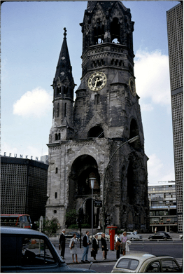 Another site that impacted me greatly was in the heart of downtown West Berlin, along the Kurfurstendam, affectionately known by the locals as the Kudam, which is the main shopping street in downtown West Berlin. After the colossal disaster of World War 2, the German people decided to leave a reminder to themselves of the cost of pride and war. They left standing the bombed-out shell tower of the Kaiser Wilhelm church. And built right next to it a beautiful and modern new church and church tower. While the new structure is impressive, it cannot be fully appreciated until one is inside. The all-glass bricks are a cobalt blue, and with the sun shining through those bricks – well, all I can say is, it’s breath-taking. And peaceful. And amazing. And I’ve run out of adjectives already.